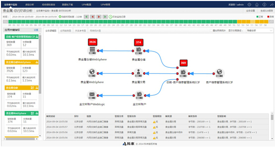 不同于其他廠商以物理網(wǎng)絡(luò)為對象的運(yùn)行維護(hù)模式,科來業(yè)務(wù)性能管理解決方案最大特色之一是以業(yè)務(wù)網(wǎng)絡(luò)為運(yùn)維對象。在部署之后系統(tǒng)會(huì)預(yù)先梳理各業(yè)務(wù)邏輯關(guān)系,建立支撐業(yè)務(wù)的應(yīng)用服務(wù)、主機(jī)系統(tǒng)、網(wǎng)絡(luò)路徑之間的關(guān)聯(lián)關(guān)系,再圍繞業(yè)務(wù)系統(tǒng)部署分析設(shè)備,制定針對性的監(jiān)控分析策略和警報(bào)策略。數(shù)據(jù)上報(bào)至UPM分析中心后,對業(yè)務(wù)網(wǎng)絡(luò)的應(yīng)用響應(yīng)性能、主機(jī)服務(wù)性能、網(wǎng)絡(luò)傳輸性能和交易處理性能進(jìn)行智能化分析,提供集成的業(yè)務(wù)網(wǎng)絡(luò)性能監(jiān)控視圖(見圖1),把所有與業(yè)務(wù)相關(guān)聯(lián)的分析結(jié)果(如性能異常警報(bào)、關(guān)鍵性能指標(biāo)、多段數(shù)據(jù)對比等)集成到一起,進(jìn)行圖形化顯示和關(guān)聯(lián)挖掘,一旦發(fā)生異常,即使是不熟悉業(yè)務(wù)知識(shí)的運(yùn)維人員也能根據(jù)視圖快速定位問題點(diǎn)?!邦A(yù)先的業(yè)務(wù)邏輯梳理和針對性的監(jiān)控分析,相當(dāng)于為金融機(jī)構(gòu)提供了定制化的解決方案。”高彥剛這樣告訴記者。