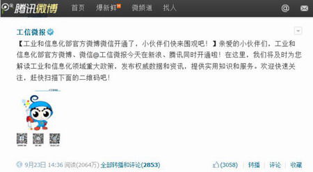 在2014華中首屆政務(wù)高峰論壇上,有數(shù)據(jù)顯示,截至今年9月經(jīng)騰訊微博平臺(tái)認(rèn)證的政務(wù)微博已超過18萬個(gè),其中黨政機(jī)構(gòu)微博115,174個(gè);經(jīng)騰訊微信平臺(tái)認(rèn)證的政務(wù)微信已達(dá)到6000個(gè),“雙微”聯(lián)動(dòng)已成為公共服務(wù)領(lǐng)域的新趨勢(shì)。作為互聯(lián)網(wǎng)行業(yè)主管部門,工信部官方微博、微信同步上線,也為“雙微政務(wù)”陣容再添一員猛將。