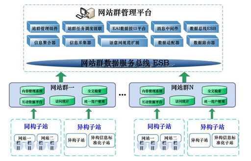 系統(tǒng)采用網(wǎng)站群數(shù)據(jù)服務(wù)總線的概念,系統(tǒng)包括站群管理、站群任務(wù)調(diào)度級聯(lián)、EAI數(shù)據(jù)接口平臺(tái)、消息中間件、數(shù)據(jù)總線ESB、信息聚合器、信息采集器、語義網(wǎng)規(guī)范擴(kuò)展、數(shù)據(jù)適配器、數(shù)據(jù)路由器,實(shí)現(xiàn)對網(wǎng)站群內(nèi)容管理系統(tǒng)、互動(dòng)平臺(tái)、統(tǒng)一用戶、站群訪問統(tǒng)計(jì)、站群全文檢索的統(tǒng)一數(shù)據(jù)管理。