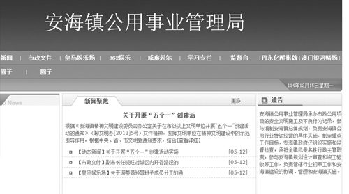 記者點開鏈接,乍一看,像是個正規(guī)網(wǎng)站,仔細一瞧,發(fā)現(xiàn)這個頁面無論是網(wǎng)站結(jié)構(gòu)還是美工程度都比較粗糙。頁面正上方有著大大的“安海鎮(zhèn)公用事業(yè)管理局”幾個字,下面一欄導(dǎo)航中有十個小欄目,其中包括“動態(tài)新聞”、“市政文件”等,令人咋舌的是,竟然還有“皇馬娛樂場”、“丹東億酷棋牌”、“澳門銀河賭場”等欄目。記者試著打開“皇馬娛樂場”欄目,跳出的是一個充滿各種賭場廣告和賭博信息的網(wǎng)站。