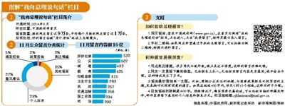 在這個(gè)欄目中,網(wǎng)友填寫個(gè)人信息后,就可以給總理留言,發(fā)表自己的看法。欄目開通至今,已接收網(wǎng)友留言近9萬條,平均每個(gè)月近1萬條。