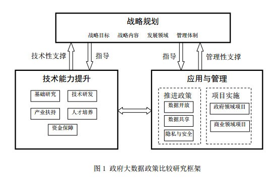 當(dāng)前,數(shù)據(jù)已經(jīng)滲透到各個行業(yè)和業(yè)務(wù)職能領(lǐng)域,數(shù)據(jù)的與日俱增昭示著大數(shù)據(jù)時代已經(jīng)來臨,對數(shù)據(jù)的科學(xué)運用將成為國家競爭力的重要組成部分。大數(shù)據(jù)時代,政府的重要職責(zé)不僅僅是強化自身對數(shù)據(jù)的開發(fā)利用,更重要的是推動大數(shù)據(jù)產(chǎn)業(yè)的發(fā)展和全社會的大數(shù)據(jù)應(yīng)用。為研究國內(nèi)外政府大數(shù)據(jù)相關(guān)政策,本文建立了如下政策比較框架,擬從戰(zhàn)略規(guī)劃、技術(shù)能力提升、應(yīng)用與管理三個方面全面透徹地比較分析各國政策著力點。
