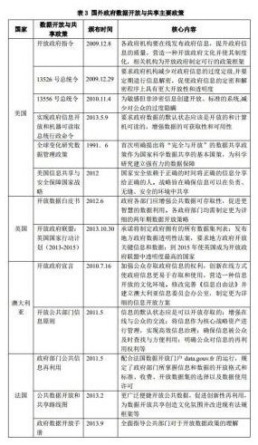 大數(shù)據(jù)應(yīng)用的基礎(chǔ)是數(shù)據(jù)足量全面。為加強各部門所掌握的海量數(shù)據(jù)資產(chǎn)開放與共享,促進社會應(yīng)用創(chuàng)新,美、英、澳、法等國政府均制定政府?dāng)?shù)據(jù)開放共享政策。具體統(tǒng)計如下表: