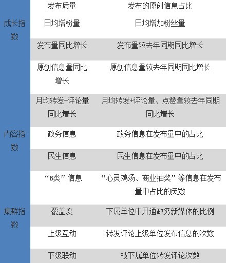 注:成長指數(shù)一項中的數(shù)值均為某賬號考量值和行業(yè)平均值的比值圖1:中國政務(wù)新媒體排行榜評估體系樹狀圖