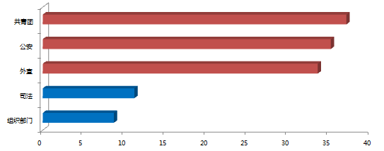 2014年,共青團、公安、外宣、司法、組織部門的政務(wù)微博在全國政務(wù)微博中覆蓋度最廣,表現(xiàn)最為活躍,其中共青團、公安類、政府外宣類政務(wù)微博賬號數(shù)量占比較高,構(gòu)成了政務(wù)微博中的第一梯隊。