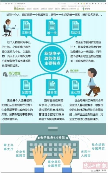 珠江時報訊 想找政府辦事,但是不知道由什么部門負(fù)責(zé)怎么辦?今后,這樣的困難將有望得到解決。昨日,佛山市經(jīng)濟(jì)和信息化局召開以個人和組織為中心的新型電子政務(wù)體系暨企業(yè)專屬網(wǎng)頁啟動新聞發(fā)布會。該局副局長謝國高表示,我市將建設(shè)電子政務(wù)4.0,個人或組織都將有自己專屬辦事頁面,里面囊括了個人和組織要到政府辦理的所有事項,以及辦理渠道。