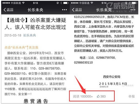 在這起“通緝令”傳播事件中,未央?yún)^(qū)網(wǎng)信辦負(fù)責(zé)人介紹說(shuō)是出于對(duì)市民的提醒,維護(hù)社會(huì)和諧。在朋友圈瘋狂轉(zhuǎn)發(fā)的市民出于對(duì)自身安全權(quán)益的保護(hù),自覺(jué)轉(zhuǎn)發(fā)。此時(shí)公眾利益與政府訴求是高度一致的。“通緝令”文章在官方認(rèn)證公號(hào)已經(jīng)發(fā)出,似乎坐上了火箭,半日內(nèi)閱讀量極速超過(guò)10萬(wàn)。