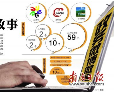 據(jù)李文軍介紹,與此同時(shí),江門政府的門戶網(wǎng)站嘗試與微博、微信對(duì)接,去年開始集合各部門的微博,打包在網(wǎng)站上展示。接下來微信也需要這樣整合,屆時(shí)有可能市民加了一個(gè)微信公眾號(hào)就可以在上面看到各部門微信公眾號(hào)。但具體怎么樣做,我們也在探索。