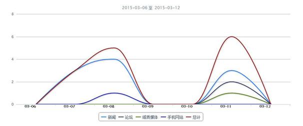 從上圖可看出,事件發(fā)展趨勢(shì)較為起伏,整個(gè)事件的爆發(fā)是在03-07。新聞?lì)愋偷臄?shù)據(jù)較為突出,在03-11的變化最明顯,媒體和網(wǎng)民對(duì)此事給予了高度的關(guān)注,一度將事態(tài)發(fā)展推向高點(diǎn)。