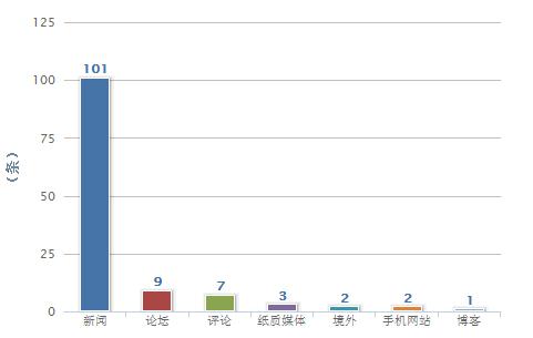 截止3月12日,新華網(wǎng)網(wǎng)絡(luò)輿情服務(wù)平臺(tái)從新聞、論壇、博客、評(píng)論、紙質(zhì)媒體、視頻、手機(jī)網(wǎng)站等各個(gè)類(lèi)型的數(shù)據(jù)進(jìn)行監(jiān)測(cè),結(jié)果顯示數(shù)據(jù)總量約為125篇,其中新聞?lì)愋偷臄?shù)據(jù)最多,約為101篇。人民網(wǎng)網(wǎng)站有12篇,中國(guó)新聞網(wǎng)網(wǎng)站有8篇,南方網(wǎng)網(wǎng)站有5篇。