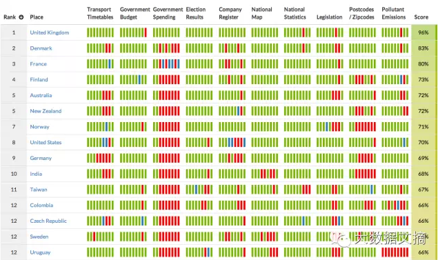 開放數(shù)據(jù)指數(shù)通過評(píng)估各國10個(gè)關(guān)鍵數(shù)據(jù)集,例如政府項(xiàng)目級(jí)支出數(shù)據(jù)、國家公共交通時(shí)刻表、環(huán)境污染指數(shù)等的可獲取性和可訪問性來進(jìn)行國家級(jí)開放數(shù)據(jù)項(xiàng)目績(jī)效排序。 2014年,英國再摘開放數(shù)據(jù)指數(shù)的桂冠,總體開放性達(dá)到了96%,而緊隨其后的則是丹麥以及去年排名才12位而今年已到第3位的法國。第4位的是芬蘭,而第5位則由澳大利亞和新西蘭共享。今年的指數(shù)結(jié)果里最令人振奮的有去年排名27而今年進(jìn)步到第10位的印度,以及共同占據(jù)第12位的拉丁美洲的哥倫比亞和烏拉圭。 塞拉利昂,馬里共和國,海地以及幾內(nèi)亞在今年的開放數(shù)據(jù)指數(shù)中墊底,但需要指出的,還有更多比這些政府在數(shù)據(jù)開放性上更糟糕的,這里沒有包含他們主要是因?yàn)闆]有足夠的公開數(shù)據(jù)以供評(píng)估以及當(dāng)?shù)貨]有足夠的志愿者來完成相應(yīng)的評(píng)估。 整體而言,雖然開放的關(guān)鍵數(shù)據(jù)集整體數(shù)量有所上升(從87到104),但開放數(shù)據(jù)集占整體的比例仍舊很低,僅為11%。 即使對(duì)于那些在開放數(shù)據(jù)項(xiàng)目上的領(lǐng)頭國家,也有大量的提升空間:比如對(duì)于美國和德國,他們就沒有提供整合的、開放的企業(yè)注冊(cè)數(shù)據(jù)庫。而政府項(xiàng)目級(jí)支出的數(shù)據(jù)開放性也讓人大失所望,大多數(shù)國家要么完全沒有提供此類信息,又或者僅提供了有限的信息。在97個(gè)國家中,僅有英國和希臘兩個(gè)國家提供了完全開放的政府項(xiàng)目級(jí)支出數(shù)據(jù)。在目前各國經(jīng)濟(jì)增長(zhǎng)仍舊緩慢甚至艱巨的時(shí)期,提供市民和企業(yè)免費(fèi)開放的數(shù)據(jù)意味著我們能夠更高效的開源節(jié)流,以及提高政府效能。 Pollock 說道: