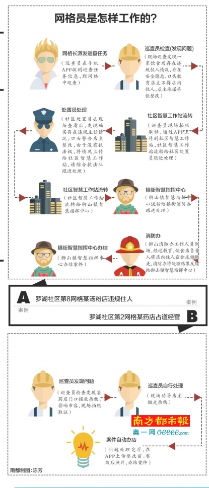 “以前檢查一個工廠,今天安監(jiān)去,明天消防去,后天城管去,對企業(yè)干擾多次,現在一個巡查員去一次就搞掂了。”羅湖社區(qū)黨委副書記、社區(qū)服務中心主任吳其國介紹,實施網格化之后,該社區(qū)40多名工作人員進行重新整合,成為網格里的巡查員、處置員、坐席員,并無增員。