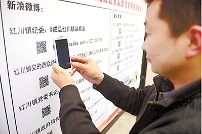 去年3月,在甘肅省成縣的政務公開欄前,一名居民在掃描政務二維碼。