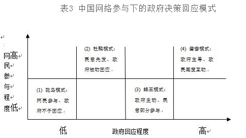 總之,鴛鴦模式為未來制度化、常態(tài)化的有效政府決策和有序規(guī)范的網(wǎng)絡(luò)參與提供了有益的理論依據(jù)。在網(wǎng)絡(luò)參與環(huán)境下,要改進(jìn)政府決策回應(yīng)力,化解網(wǎng)絡(luò)政治風(fēng)險(xiǎn),引導(dǎo)規(guī)范、有序的網(wǎng)絡(luò)參與,其思路和對策可以從以下方面來考慮:第一、改進(jìn)信息發(fā)布制度,樹立政府信息源權(quán)威。這是從網(wǎng)絡(luò)參與的權(quán)力和信息機(jī)制出發(fā)的。第二、建立開放性的政策制定網(wǎng)絡(luò)系統(tǒng),建設(shè)參與回應(yīng)型政府,整合成為整體型政府(Holistic Government)。[37]這是從公共決策的目的出發(fā)的。第三、改革政府決策機(jī)制,提高政治參與的成本收益率。這是從防止無序網(wǎng)絡(luò)參與發(fā)生出發(fā)的。第四、完善網(wǎng)絡(luò)立法,規(guī)范網(wǎng)絡(luò)參與秩序。這是從規(guī)范網(wǎng)絡(luò)參與程序出發(fā)的。