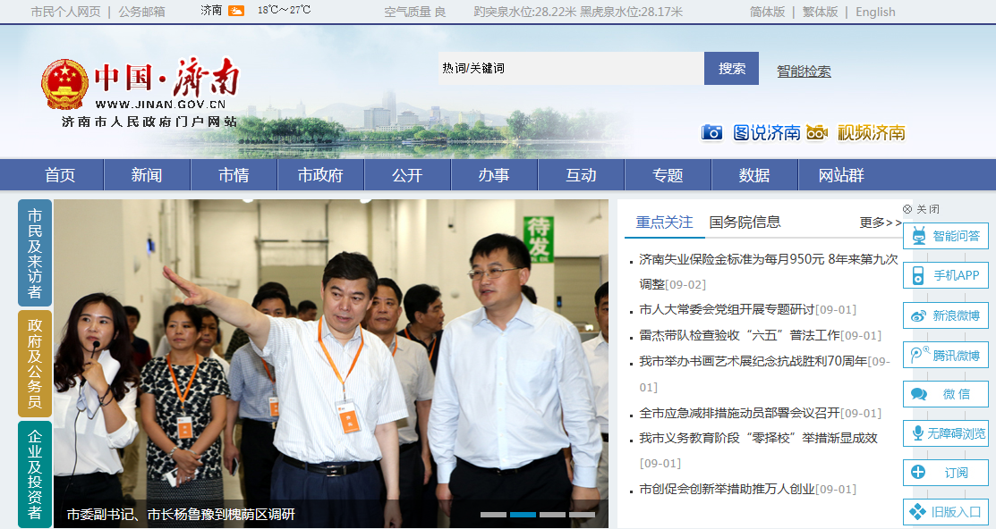 “中國·濟(jì)南”(濟(jì)南市政府門戶網(wǎng)站)由濟(jì)南市人民政府辦公廳主辦,是市政府設(shè)立的面向公眾和社會的政務(wù)外網(wǎng)門戶。濟(jì)南市政府門戶網(wǎng)站以政府部門網(wǎng)站為依托,以用戶為中心,以需求為導(dǎo)向,以服務(wù)為宗旨,成為政府和公眾、企業(yè)聯(lián)系的橋梁,成為政務(wù)信息公開的主渠道,有力地促進(jìn)了濟(jì)南市建設(shè)陽光政府、服務(wù)政府、法治政府、責(zé)任政府的進(jìn)程。