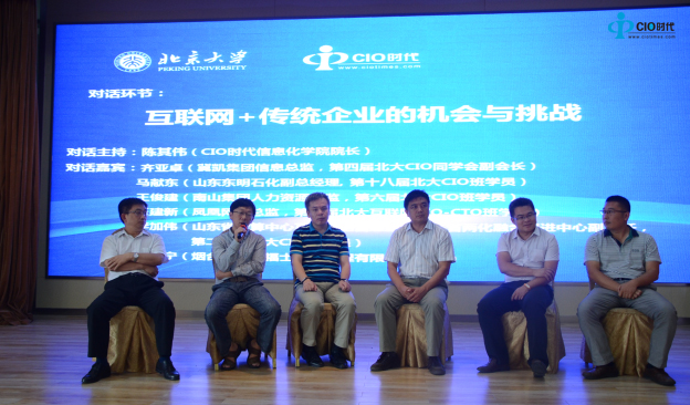 主題演講結束之后進入到本次論壇的對話環(huán)節(jié),對話環(huán)節(jié)由CIO時代信息化學院院長陳其偉先生主持,冀凱集團信息總監(jiān),第四屆北大CIO同學會副會長齊亞卓、山東東明石化副總經理, 第十八屆北大CIO班學員馬獻東、南山集團人力資源總監(jiān),第六屆北大CIO班學員王俊建、鳳凰網IT總監(jiān),第二屆北大互聯(lián)網CIO-CTO班學員王建新、山東省計算中心互聯(lián)網運營總監(jiān),山東省兩化融合促進中心副主任,第二十屆北大CIO班學員李加偉、煙臺中集來福士海洋工程有限公司經理蘇振寧參與了對話研討,共同就“互聯(lián)網+時代傳統(tǒng)企業(yè)的機會與挑戰(zhàn)”這一話題展開討論,各位嘉賓首先分析自己企業(yè)的優(yōu)勢劣勢所在以及目前發(fā)展面臨的難題,也分享了互聯(lián)網+能夠為企業(yè)帶來的新機會以及企業(yè)在互聯(lián)網+道路上面臨的新問題,大家各抒己見,從各自產業(yè)出發(fā),談痛點、找方向,分享各自成功經驗!