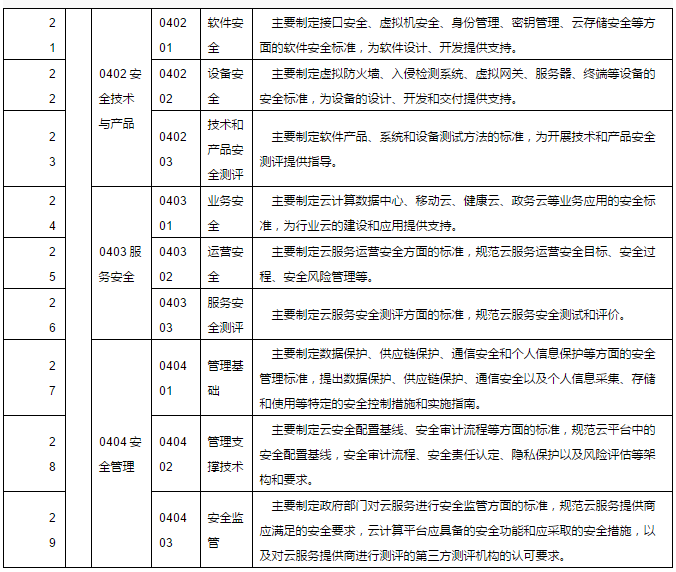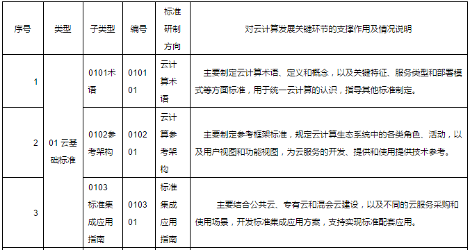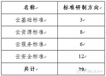 以云計算綜合標(biāo)準(zhǔn)化體系框架為基礎(chǔ),通過研究分析信息技術(shù)和通信領(lǐng)域已有標(biāo)準(zhǔn),提出現(xiàn)有標(biāo)準(zhǔn)缺失的,并能直接反映云計算特征,有效解決應(yīng)用和數(shù)據(jù)遷移、服務(wù)質(zhì)量保證、供應(yīng)商綁定、信息安全和隱私保護等問題的29個標(biāo)準(zhǔn)研制方向(如表1,詳見附件2),以指導(dǎo)具體標(biāo)準(zhǔn)的立項和制定。對尚未納入標(biāo)準(zhǔn)研制方向但在云計算綜合標(biāo)準(zhǔn)化體系框架中列出的,統(tǒng)一作為標(biāo)準(zhǔn)化需求研究方向。