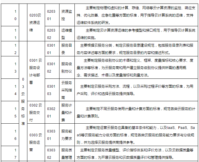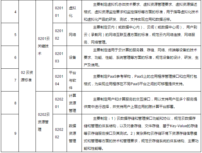 2.云資源標(biāo)準(zhǔn)。用于規(guī)范和引導(dǎo)建設(shè)云計算系統(tǒng)的關(guān)鍵軟硬件產(chǎn)品研發(fā),以及計算、存儲等云計算資源的管理和使用,實現(xiàn)云計算的快速彈性和可擴展性。主要包括關(guān)鍵技術(shù)、資源管理和資源運維等方面的標(biāo)準(zhǔn)。