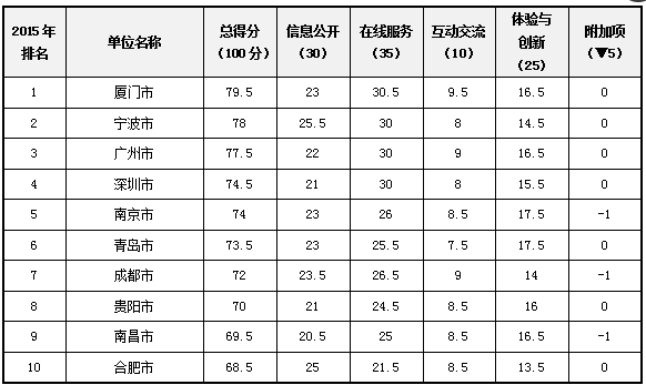 2015中國(guó)省會(huì)及計(jì)劃單列市政府網(wǎng)站績(jī)效評(píng)估前10名如下:
