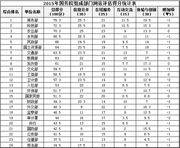 如下是2015年國(guó)務(wù)院組成部門政府網(wǎng)站績(jī)效評(píng)估得分排名: