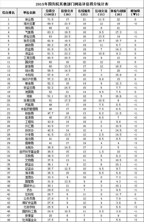如下是2015年國務(wù)院其他部門網(wǎng)站績效評(píng)估得分排名: