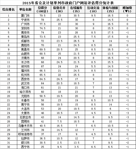 如下是2015年省會(huì)及計(jì)劃單列市政府網(wǎng)站績效評估得分排名: