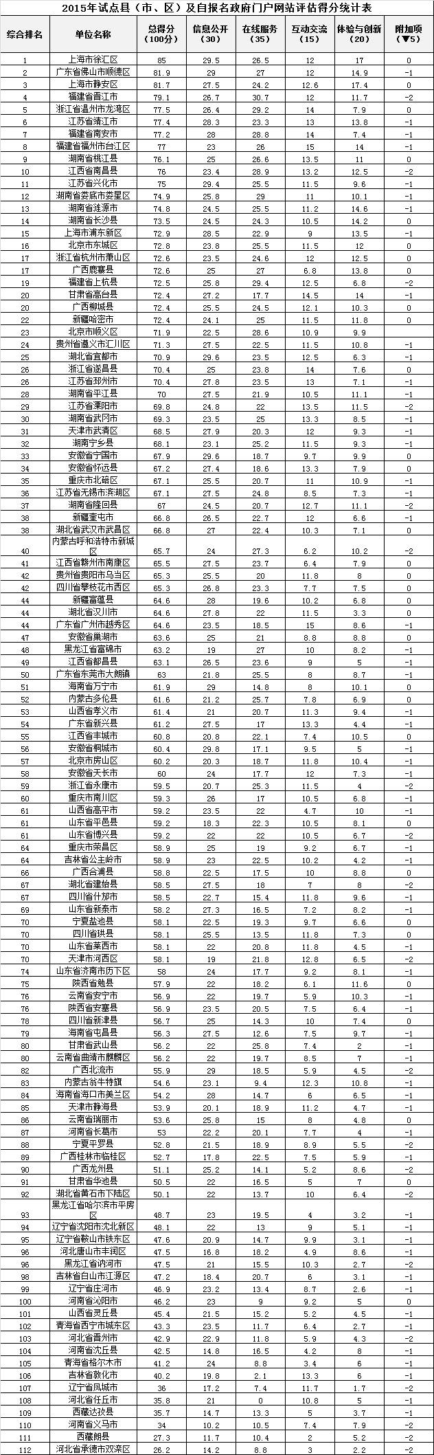 如下是2015年試點(diǎn)縣(市、區(qū))及自報(bào)名政府門戶網(wǎng)站績(jī)效評(píng)估得分排名: