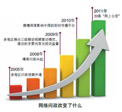 2015 年政府工作報(bào)告 “原汁原味”地吸納了46 條網(wǎng)民建言,7 位網(wǎng)民進(jìn)中南海領(lǐng)獎(jiǎng),網(wǎng)絡(luò)問(wèn)政日漸深入人心,并形成政府聽(tīng)民意、匯民智、聚民心的新機(jī)制。