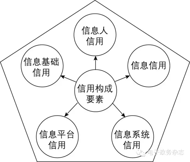 信息平臺(tái)依靠信息基礎(chǔ)建設(shè),是信息系統(tǒng)和信息的載體,也是信息人操作的工具和對(duì)象。狹義的信息平臺(tái)僅包括網(wǎng)絡(luò)平臺(tái)、存儲(chǔ)平臺(tái)和應(yīng)用平臺(tái),而廣義的信息平臺(tái)還包括硬件設(shè)備、程序系統(tǒng)和人。所以,信息平臺(tái)信用可涵蓋信息平臺(tái)狹義范疇中各要素的信用,也可涵蓋信息平臺(tái)廣義范疇中各要素的信用。此外,基于以下考慮,信息平臺(tái)信用的外延還有擴(kuò)展的必要:其一,電子政府構(gòu)建旨在建設(shè)開放統(tǒng)一的信息平臺(tái),這就必然要求各級(jí)政府及其部門進(jìn)行跨地區(qū)、跨層級(jí)、跨部門合作,共建共享,互聯(lián)互通,業(yè)務(wù)協(xié)同。如此,信息平臺(tái)信用就必然涉及參與其中的各級(jí)政府及其部門的信用,其中任何一方的信用缺失和行為失范都會(huì)影響到整體信用,需要建立工作標(biāo)準(zhǔn)和行為規(guī)則來約束。因此,平臺(tái)的工作標(biāo)準(zhǔn)、行為規(guī)則以及整合在平臺(tái)上的各級(jí)政府及其部門的信用也將成為信息平臺(tái)信用的構(gòu)成要素。其二,統(tǒng)一的信息平臺(tái)需要以資源共享和業(yè)務(wù)協(xié)同作支撐,由此可見,各級(jí)政府部門所提供資源的信用,以及業(yè)務(wù)協(xié)同中各部門的信用,連同辦事流程的信用也應(yīng)成為信息平臺(tái)信用的構(gòu)成要素。其三,信息平臺(tái)依靠IT企業(yè)建設(shè)和運(yùn)維,也需要政府內(nèi)部事業(yè)編制的技術(shù)部門支持,因而企業(yè)和技術(shù)部門的信用將直接影響信息平臺(tái)的質(zhì)量和績(jī)效。