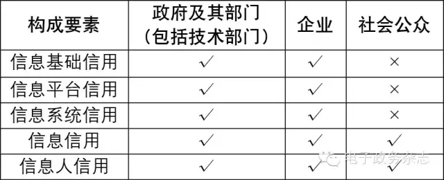 在大數(shù)據(jù)時(shí)代,政府可以獲取大量有關(guān)自身、其他政府及其部門、企業(yè)和社會(huì)公眾的信用狀況記錄,但這些記錄并不一定是客觀的,還混雜有主觀的成分,需要政府在進(jìn)行管理和決策的過程中深入挖掘、辨識(shí)和使用。如何確定數(shù)據(jù)信用以及保證據(jù)此做出的管理和決策公平公正是政府的職責(zé)所在,但取決于政府的能力。政府不得不依靠其他組織,與企業(yè)和社會(huì)公眾建立良好的合作關(guān)系,表1中顯示了電子政府信用關(guān)系的各個(gè)承載者。其中,社會(huì)公眾雖不是信息基礎(chǔ)、信息平臺(tái)、信息系統(tǒng)的直接建設(shè)者和運(yùn)維者,卻因廣泛滲透與頻繁使用信息基礎(chǔ)、信息平臺(tái)和信息系統(tǒng),而成為其不可或缺的信用主體。