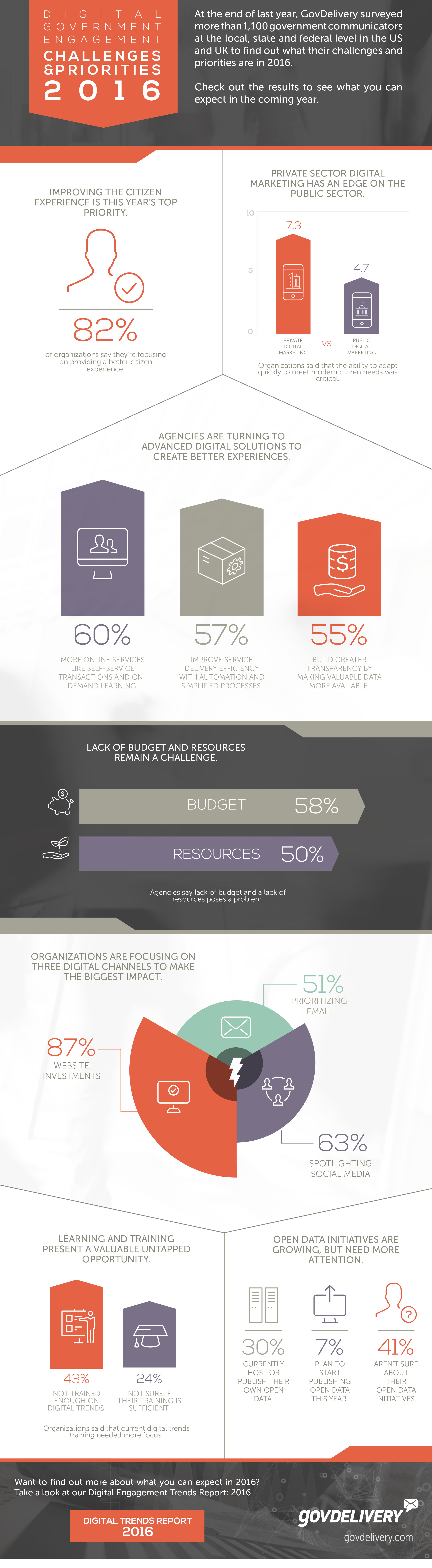 以基于云解決方案提升公眾體驗(yàn)的領(lǐng)先公司GovDelivery,通過聯(lián)邦、州和英國當(dāng)?shù)亟M織調(diào)查超過1100的公共部門,今日(當(dāng)?shù)貢r(shí)間21日)發(fā)布了數(shù)字政府趨勢信息圖表和詳細(xì)的數(shù)字年度報(bào)告。該報(bào)告中的圖表顯示了各級政府和公共部門2016年的核心工作與挑戰(zhàn),以及公共部門如何滿足其需求。