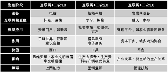 近年來,隨著我國農(nóng)村制度改革的不斷推進和農(nóng)業(yè)經(jīng)濟的快速發(fā)展,“三農(nóng)”領(lǐng)域的整體發(fā)展水平在一定程度上得以提升?!盎ヂ?lián)網(wǎng)+”作為新常態(tài)下推動生產(chǎn)方式轉(zhuǎn)變和生產(chǎn)效率提升的強力引擎,正逐步滲透到行業(yè)發(fā)展以及社會運轉(zhuǎn)的每一個環(huán)節(jié)中,在彌合城鄉(xiāng)差距、倒逼“三農(nóng)”改革方面初見成效。但同時我們也應(yīng)清醒地認識到,城鄉(xiāng)數(shù)字鴻溝、農(nóng)村信息孤島等現(xiàn)象依然存在,諸多“互聯(lián)網(wǎng)+”三農(nóng)應(yīng)用與模式尚在探索,在用戶習(xí)慣、思維、能力方面的培養(yǎng)尚需繼續(xù)加強。通過研究,“互聯(lián)網(wǎng)+”三農(nóng)可分為三個階段,并在上網(wǎng)設(shè)備、互聯(lián)網(wǎng)接受程度、典型應(yīng)用、作用、價值、影響、障礙等方面呈現(xiàn)不同特征。