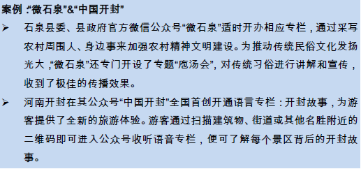 政民交流互動,收集民意:微信公眾平臺提高了農(nóng)村事務(wù)的知曉率,也提高了村民的參與度,有利于民情收集。例如,鴻山鎮(zhèn)伍堡村委會每月都會在微信上收到村民對村務(wù)工作的意見和建議,并將匯總的意見和反饋情況在微信上公開,極大提高了村民的滿意度;圍頭村根據(jù)公眾號收集到的來自游客的反饋和建議,創(chuàng)新了首個民宿試點、戰(zhàn)地食堂等多個旅游產(chǎn)品,有力地提高了景區(qū)的吸引力。據(jù)統(tǒng)計,當(dāng)年來圍頭灣的游客總量達到75萬人次。