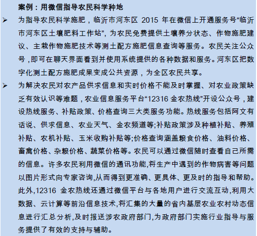 靠經(jīng)驗種田、市場信息不對稱的時代正在遠去:微信通過服務(wù)號和訂閱號實現(xiàn)了農(nóng)民與專家、農(nóng)民與市場的連接,逐步形成了集農(nóng)業(yè)信息發(fā)布、農(nóng)產(chǎn)品宣傳、農(nóng)資信息查詢和農(nóng)業(yè)生產(chǎn)咨詢服務(wù)為一體的綜合移動服務(wù)窗口,為農(nóng)民開展農(nóng)業(yè)生產(chǎn)活動提供專業(yè)指導(dǎo)。