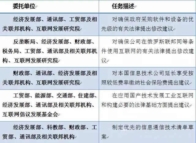 普京在首屆俄互聯(lián)網(wǎng)論壇上指出,考慮到全球網(wǎng)絡(luò)發(fā)展總趨勢,俄羅斯的互聯(lián)網(wǎng)發(fā)展需要做好長期發(fā)展戰(zhàn)略規(guī)劃。在對總趨勢做出判斷的同時,要尊重我們的合作和競爭伙伴,為互聯(lián)網(wǎng)市場的所有參與者提供統(tǒng)一的發(fā)展條件,并在不違反WTO框架協(xié)議的前提下,適當(dāng)考慮對市場參與者提供優(yōu)惠措施。普京在論壇上簽署了關(guān)于構(gòu)建俄羅斯互聯(lián)網(wǎng)經(jīng)濟的委托文件,具體包括16項委托任務(wù)。