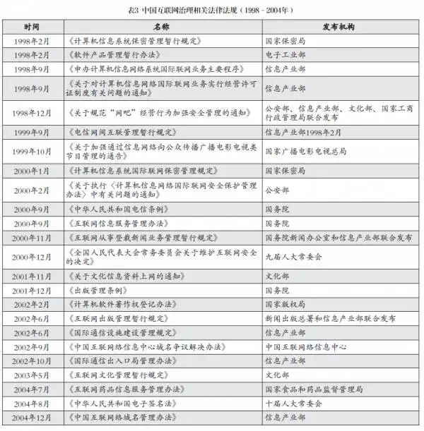 第二,“先發(fā)展,后管理”成為隱性的指導(dǎo)思想。“先發(fā)展,后管理”是20多年來(lái)中國(guó)互聯(lián)網(wǎng)順利發(fā)展的思想保障??疾觳煌瑫r(shí)期主題和政府關(guān)注點(diǎn),可發(fā)現(xiàn)互聯(lián)網(wǎng)治理大致經(jīng)歷從潛伏、爆發(fā)到可控的過(guò)程。