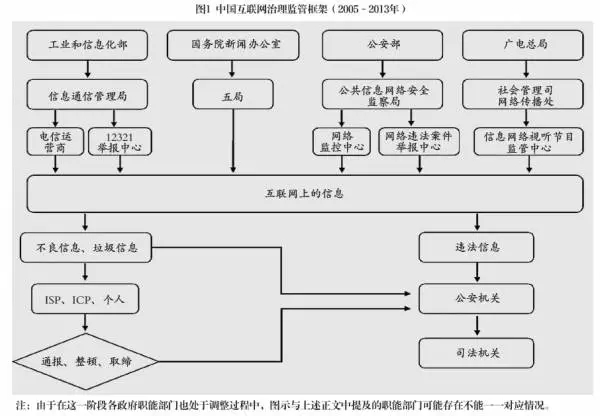 第三,對(duì)我國(guó)互聯(lián)網(wǎng)信息內(nèi)容管理的主管機(jī)構(gòu)、制度建設(shè)進(jìn)程特點(diǎn)進(jìn)行了研究。張文祥認(rèn)為,從1994年接入互聯(lián)網(wǎng)以來(lái),新聞信息就是我國(guó)互聯(lián)網(wǎng)信息管理的重要對(duì)象,經(jīng)過(guò)20年的探索,目前已形成一套復(fù)雜的互聯(lián)網(wǎng)新聞信息管理制度,帶有較為濃重的“規(guī)制摸索”特征。曠野認(rèn)為,自上個(gè)世紀(jì)90年代起,我國(guó)的信息化制度建設(shè)進(jìn)程明顯加快,一個(gè)與信息化發(fā)展相適應(yīng)的法制環(huán)境正在形成。主要表現(xiàn)在:(1)數(shù)據(jù)電文的法律制度已經(jīng)形成;(2)互聯(lián)網(wǎng)信息分類管理的法律框架已具雛形;(3)電信法、廣播網(wǎng)分業(yè)監(jiān)管的格局基本維持;(4)信息技術(shù)應(yīng)用的相關(guān)法律制度仍在探索完善中;(5)信息安全的法律制度已有一定基礎(chǔ)。高宏存、于正認(rèn)為,網(wǎng)絡(luò)新媒體的監(jiān)管反映出政府治理水平提升的過(guò)程,并總結(jié)了四類參與網(wǎng)絡(luò)新媒體管制的行政機(jī)構(gòu):(1)接入監(jiān)管部門,如工信部門與工商部門;(2)安全管理部門,如公安部門和國(guó)家安全部門;(3)中央和地方的新聞辦公室和對(duì)外宣傳辦公室是我國(guó)網(wǎng)絡(luò)新媒體最直接的內(nèi)容管制部門;(4)其他有關(guān)部門,主要指文化部門、新聞出版部門、廣電部門。他們將新媒體的監(jiān)管劃分為四個(gè)階段:奠基起步階段、激勵(lì)發(fā)展階段、問(wèn)題治理階段、綜合治理階段。分別涉及的核心議題包括基礎(chǔ)設(shè)施保護(hù)、信息服務(wù)管理、傳播權(quán)利保護(hù)、不良信息整治。