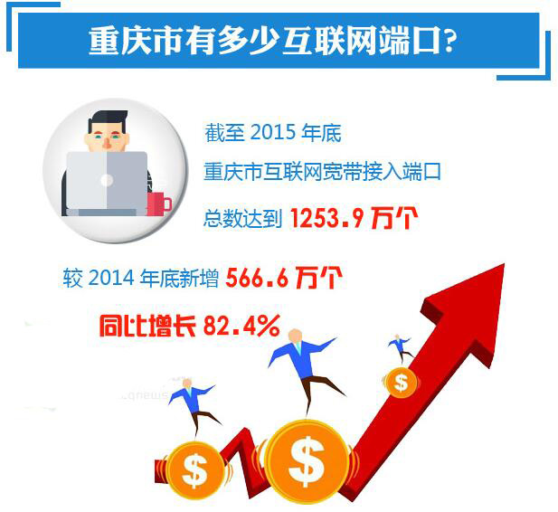 報(bào)告顯示,截至 2015 年底,重慶市光纜線路總長度達(dá)到 65.4萬公里,同比增長11.8%;互聯(lián)網(wǎng)寬帶接入端口總數(shù)達(dá)到 1253.9 萬個,較2014 年底新增 566.6 萬個,同比增長 82.4%。重慶市互聯(lián)網(wǎng)寬帶接入用戶中,速率在 8M 以上用戶占比 75.3%,較 2014 年提高 42.4 個百分點(diǎn),居全國第 17位。其中,速率在 20M 以上的寬帶用戶達(dá)到 189.3 萬戶,占比達(dá)到 37.4%,居全國第 15 位。重慶市移動電話基站數(shù)達(dá)到 9.0 萬個,較 2014 年底新增 1.6 萬個,同比增長 21.6% ;WLAN 公共運(yùn)營接入點(diǎn)(AP)數(shù)達(dá)到 13.0 萬個;3G 基站數(shù)達(dá)到2.8萬個,較2014年新增0.1萬個,同比增長3.7%;4G基站數(shù)達(dá)到3.0萬個。可以看出,目前重慶市的網(wǎng)絡(luò)成長能力大幅提升,網(wǎng)絡(luò)基礎(chǔ)設(shè)施已具備為重慶市“互聯(lián)網(wǎng) +”發(fā)展提供堅(jiān)實(shí)基礎(chǔ)的條件。2015年,重慶市網(wǎng)絡(luò)基礎(chǔ)設(shè)施建設(shè)日趨完善。