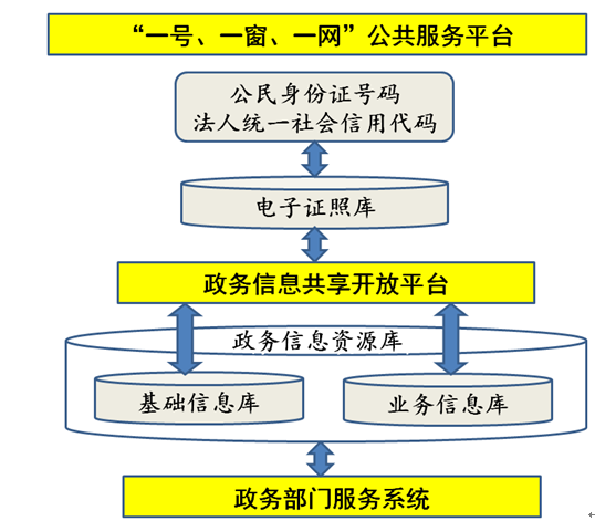 “一號、一窗、一網”的信息共享開放業(yè)務架構為:通過統(tǒng)一的公民身份證號、法人統(tǒng)一社會信用代碼和綁定身份證號及法人代碼的實名電子證照,對接教育服務、醫(yī)療衛(wèi)生、社會保險、社會福利、社會救助、住房公積金、勞動就業(yè)、婚姻登記、殯葬服務、住房保障、公共安全等民生服務領域的政務信息共享和開放,實現“一號申請、一窗受理、一網通辦”的政務服務。