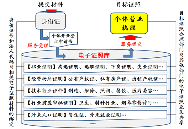“一號”申請與電子證照互認共享業(yè)務流程。以辦理個體營業(yè)執(zhí)照為例:申請人到工商所提交身份證件,填寫《個體開業(yè)登記申請書》,由于相關的職業(yè)證明、經營場所證明、技術行業(yè)證件、行業(yè)前置審批證明、外來人口證明等各類批文、證件、證明材料等,均已在電子證照庫中,并已與身份證件綁定,只要工商部門與其他相關部門實現各類電子證照基礎材料的互認共享,即可方便地辦理個體營業(yè)執(zhí)照(見圖2)。在以往條件下,辦理這樣的證照,申請人需要攜帶圖中的各類證照材料,并必須證明各類證照材料與申請人的關聯性,為此需要在多個部門之間“來回跑”。實施“一號”申請的惠民模式,通過對身份證號和法人代碼的服務受理,實現身份證號和法人代碼與各類證照材料的互認共享,即可快速完成電子證照的服務提交,變“群眾來回跑”為“部門協同辦”,為社會公眾提供便捷的惠民服務。