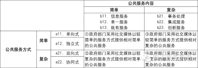 政務(wù)社交媒體的發(fā)展過程不僅與政府部門所提供的服務(wù)內(nèi)容有關(guān),而且也受到服務(wù)方式的影響。公共服務(wù)方式也具有不同的復(fù)雜性,政府部門可能通過較為簡(jiǎn)單的方式提供基于社交媒體的服務(wù),也可能以復(fù)雜的方式提供公共服務(wù)。而公共服務(wù)方式的復(fù)雜程度取決于公共服務(wù)中的技術(shù)創(chuàng)新程度、服務(wù)程序的繁簡(jiǎn)程度、是否需要多個(gè)政府部門合作等因素。