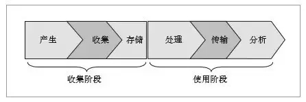 “數(shù)據(jù)”具有資產(chǎn)性,這一點(diǎn)已經(jīng)在一定程度上形成共識。最早提出通過財(cái)產(chǎn)權(quán)來保護(hù)個(gè)人數(shù)據(jù)的是美國人勞倫斯·萊斯格教授,早在他的第一版《代碼(Code)》中就已經(jīng)提出了這樣的觀點(diǎn):“財(cái)產(chǎn)制度鼓勵(lì)用戶利用財(cái)產(chǎn)權(quán)的方式來保護(hù)適當(dāng)?shù)脑S可。利用相應(yīng)的技術(shù),用戶可以創(chuàng)設(shè)許可。”勞倫斯·萊斯格教授認(rèn)為:“財(cái)產(chǎn)制度能讓用戶自由選擇不同的價(jià)值觀,這種價(jià)值觀的個(gè)人化也是法律所保護(hù)的”。同樣,數(shù)據(jù)對于不同的主體具有不同的價(jià)值屬性。數(shù)據(jù)所具有的資產(chǎn)屬性要求保護(hù)其所代表的經(jīng)濟(jì)利益以及背后的基本權(quán)利,同時(shí)也要關(guān)注數(shù)據(jù)的安全,既包括個(gè)人和企業(yè)數(shù)據(jù)的安全,也包括國家層面的網(wǎng)絡(luò)安全、信息資源的安全。數(shù)據(jù)在處理過程中涉及很多環(huán)節(jié),數(shù)據(jù)最初的產(chǎn)生、收集、存儲,后續(xù)的處理、傳輸和分析,把它們籠統(tǒng)地分為兩個(gè)階段,即數(shù)據(jù)的收集階段和數(shù)據(jù)的使用階段,如圖1所示。
