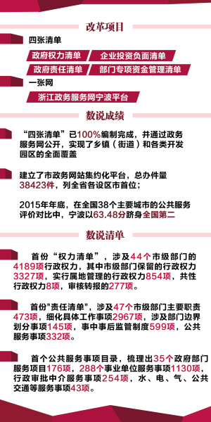 2014年,全省開始以“四張清單一張網(wǎng)”為重點的政府自身改革。作為改革前沿陣地的寧波,自然是一馬當先,全力推進政府權(quán)力清單、企業(yè)投資負面清單、政府責任清單、部門專項資金管理清單及浙江政務(wù)服務(wù)網(wǎng)寧波平臺的建設(shè)。