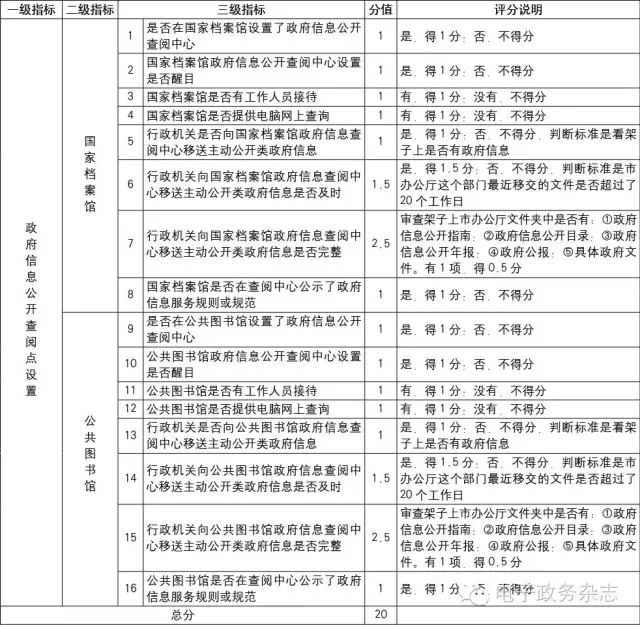 《政府信息公開條例》第十六條要求各級行政機關(guān)向檔案館和公共圖書館及時提供應該主動公開的政府信息。該條規(guī)定:各級人民政府應當在國家檔案館、公共圖書館設置政府信息查閱場所,并配備相應的設施、設備,為公民、法人或者其他組織獲取政府信息提供便利。行政機關(guān)可以根據(jù)需要設立公共查閱室、資料索取點、信息公告欄、電子信息屏等場所和設施,以公開政府信息。行政機關(guān)應當及時向國家檔案館、公共圖書館提供主動公開的政府信息。該條對向誰提供、提供什么信息、提供的時間要求等做了規(guī)定,構(gòu)成了我們評估指標設計的基礎(chǔ)。