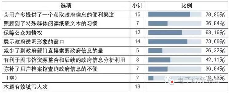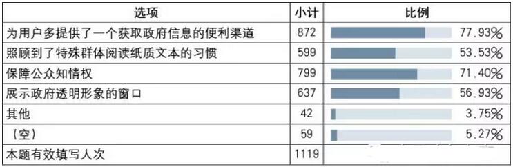 政府信息公開工作人員認為有必要繼續(xù)設置的理由(參見表16),主要是為用戶多提供了一個獲取政府信息的便利渠道,在保障公眾知情權(quán)基礎(chǔ)上,起到展示政府透明形象的積極作用。同時,還照顧到了特殊群體閱讀紙質(zhì)文本的習慣。