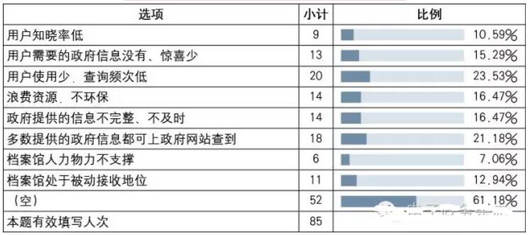 檔案館工作人員認為沒有必要繼續(xù)設置的理由(參見表12)是覺得用戶知曉率低,伴隨而來的是用戶使用少,查詢頻次低;多數(shù)提供的政府信息都可上政府網(wǎng)站查到,這意味著現(xiàn)場查閱浪費資源,不環(huán)保。加上政府提供的信息不完整、不及時,檔案館又處于被動接收地位,隨之而來的是用戶需要的政府信息沒有、驚喜少。檔案館人力物力支撐也是制約查閱中心建設完善的一個因素。