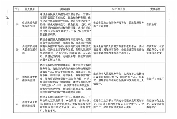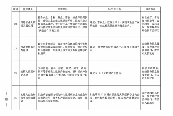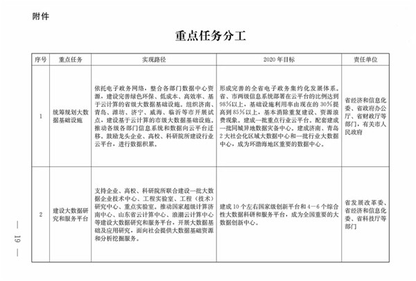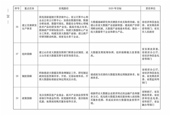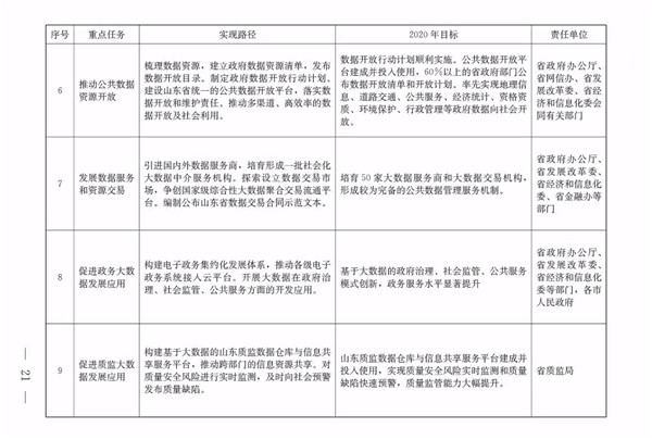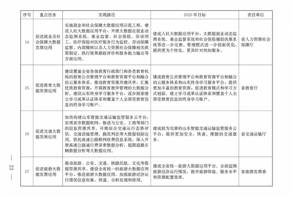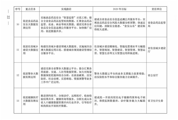 (三)總體目標。到2020年,初步形成發(fā)展氛圍濃厚、體制機制較完善、共享開放程度較高、創(chuàng)新應用范圍較廣的大數據發(fā)展格局,大數據成為提升政府治理能力、推動經濟轉型升級、塑造山東競爭新優(yōu)勢的戰(zhàn)略路徑。