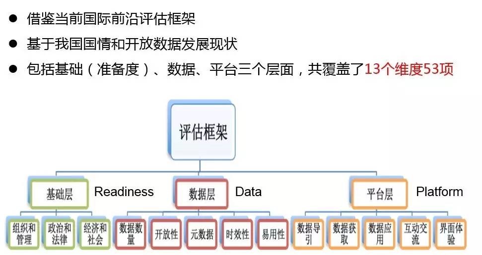 鄭磊介紹,這種從政府端進(jìn)行的評(píng)估包括三部分:在基礎(chǔ)層,包括經(jīng)濟(jì)、社會(huì)、組織、管理、人員能力等方面的準(zhǔn)備;在平臺(tái)層,包括平臺(tái)做得如何、用戶體驗(yàn)如何,獲取數(shù)據(jù)是否容易等;在基礎(chǔ)層、平臺(tái)層之上的數(shù)據(jù)層,是真正開放出來的“干貨”,包括開放數(shù)據(jù)的數(shù)量、格式、標(biāo)準(zhǔn)等。