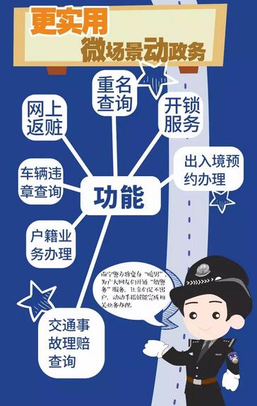 從最開始的天氣預(yù)報(bào)、快遞、百科等生活服務(wù)查詢,發(fā)展到今天的交通違章查詢、重名查詢、戶籍業(yè)務(wù)辦理進(jìn)度查詢、網(wǎng)上返贓、出入境業(yè)務(wù)預(yù)約辦理服務(wù)等等,目前,“南寧警方”微信平臺(tái)的服務(wù)功能涵蓋各個(gè)公安業(yè)務(wù),正以不斷進(jìn)取的腳步深入貫徹落實(shí)中央提出的“互聯(lián)網(wǎng)+政務(wù)”的部署精神,努力提高群眾的獲得感。