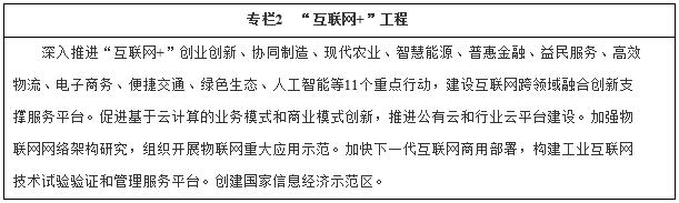 (二)推進“互聯(lián)網(wǎng)+”行動。促進新一代信息技術與經(jīng)濟社會各領域融合發(fā)展,培育“互聯(lián)網(wǎng)+”生態(tài)體系。